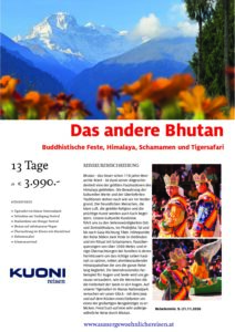 Bhutan – das heuer schon 118 Jahre Monarchie feiert – ist dank seiner Abgeschiedenheit eine der größten Faszinationen des Himalaya geblieben. Die Bewahrung der kulturellen Werte und der überlieferten Traditionen stehen nach wie vor im Vordergrund. Die freundlichen Menschen, die klare Luft, die gelebte Religion und die prächtige Kunst werden auch Euch begeistern.