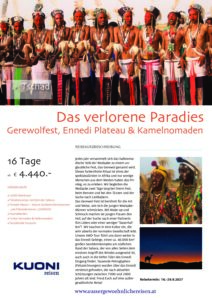 Das Gerewol-Fest ist berühmt für die Art und Weise, wie sich die jungen Wodaabe-Männer schmücken. Mit Make-up und Schmuck machen sie jungen Frauen den Hof, auf der Suche nach einer Partnerin fürs Leben oder einer weniger „dauerhaften“! Wir tauchen in eine Kultur ein, die sehr abseits der normalen Gesellschaft lebt. Unsere 4WD Tour führt uns dann weiter in das Ennedi Gebirge, einen ca. 40.000 km² großen Sandsteinkomplex am südlichen Rand der Sahara, der von allen Seiten dem erosiven Angriff des Windes ausgesetzt ist, auch auch in die tiefen Täler des Ennedi Eingang findet. Tausende Petroglyphen (Felszeichnungen) wurden über das Ennedi verstreut gefunden, die nach aktuellen Schätzungen zwischen 7000 und 2000 Jahren alt sind. Freut Euch auf eine außergewöhnliche Reise!